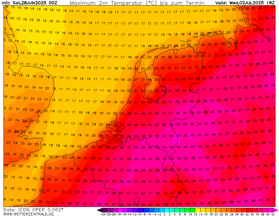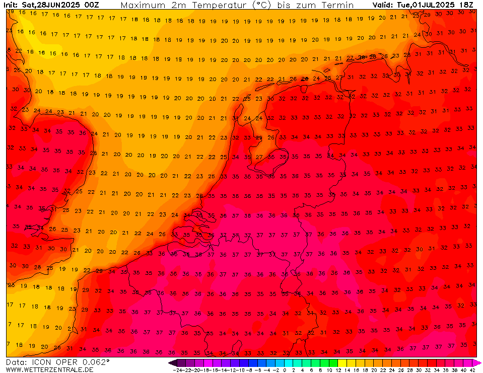 De eerste dagen van juli zullen extreem warm verlopen, met daarbij op woensdag bij Lomm, Tegelen en Venlo kans op 40°C in deze run.