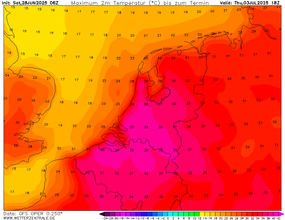 GFS oper 06Z. Vandaag tegen de 30 °C in het zuiden/Belgie