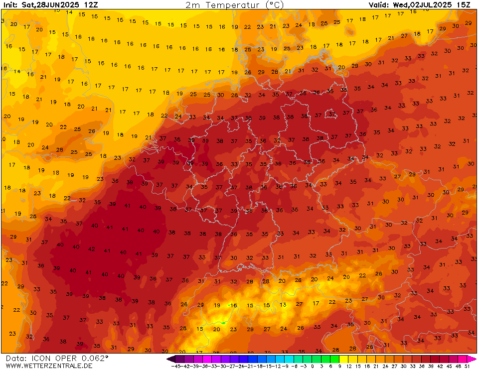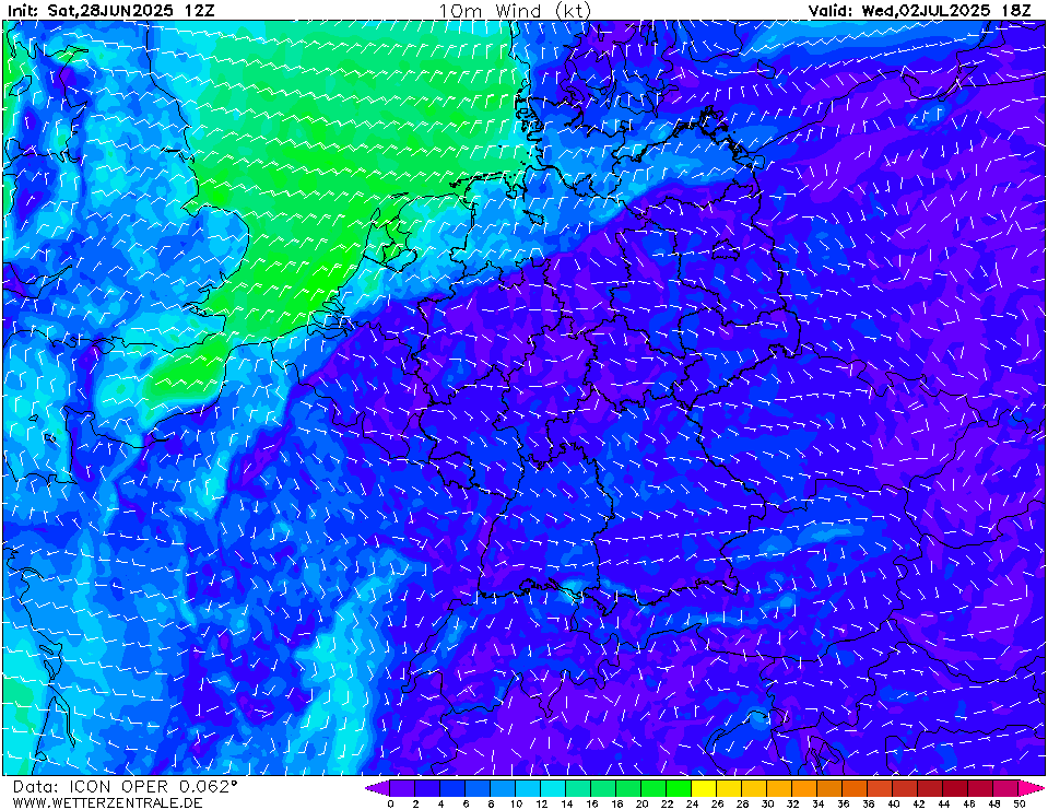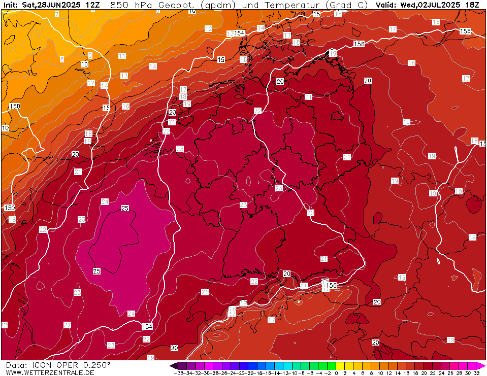 Hieronder een drietal kaarten voor aankomende woensdagmiddag; T850, wind, en temperatuur op leefniveau. T850 is over de gehele Benelux zeer hoog met waarden tussen 18 en bijna 24 graden. Maar op leefniveau zou in dit scenario de warmte/hitte in België aan de kust en de noordelijke helft van Nederland (flink) getemperd worden door een aanlandige wind. De rest van België en Nederland gaan dan gebukt onder felle bakhitte ...