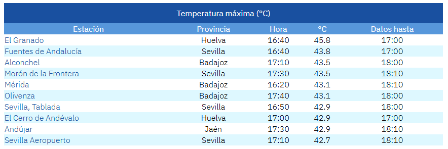 In El Granado (in de vallei van de Guadiana) werd 45,8 graden genoteerd. Dit station ligt echter erg beschut, en geeft te hoge metingen door. De hoogste pieken liggen waarschijnlijk eerder rond de 44 graden. Een semi-professioneel station bij Mértola (Portugal) schopte het tot 44,1 graden. Andere stations van het Portugese KNMI noteerden ruime 43'ers. Ook in Spanje gebeurde dit. Fuentes de Andalucia ziet er betrouwbaar uit. Morgen volgen de definitieve cijfers.