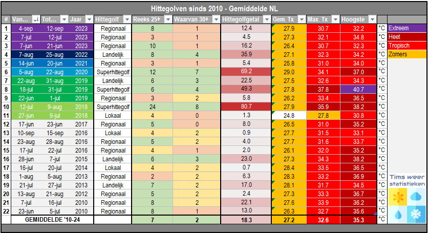 Daar is die dan weer... het hittegolf-overzicht! De laatste landelijke hittegolf beleefden we in 2022 (9 t/m 16 aug), de meest recente regionale hittegolf was die van september 2023 (4 t/m 12 sep), overigens kende 2023 maar liefst drie regionale hittegolven. 2024 verliep hittegolf-loos...