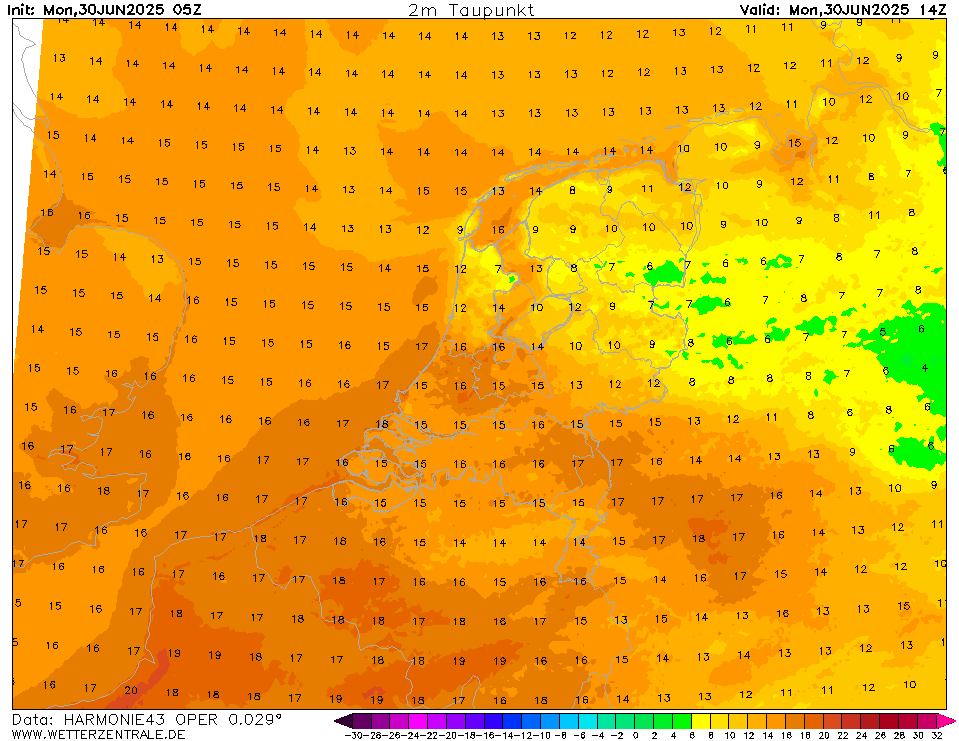 De dauwpunten blijven vandaag ook nog relatief laag in het NO'en. Voor mij persoonlijk is alles onder de 15°C meestal nog wel comfortabel.