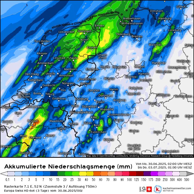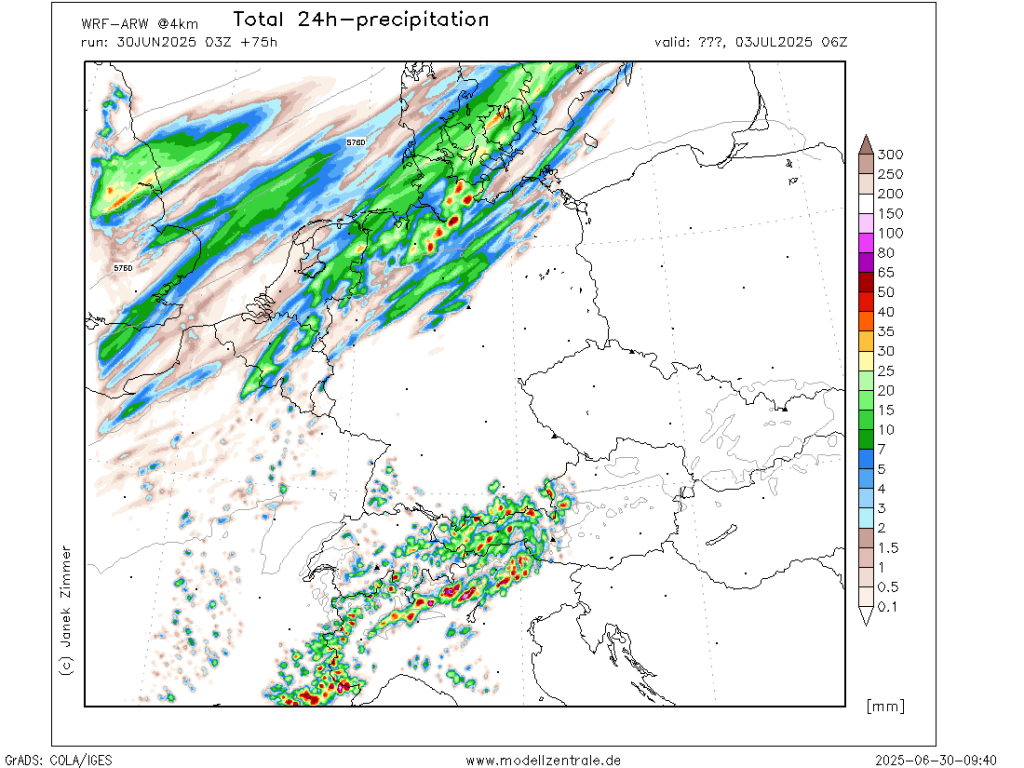 Gisteravond vroeg Maurice (Breda) om een bericht over de te verwachten (onweers-)buien op woensdag. Dat was eigenlijk nog iets te vroeg, en ook wat laat op de avond. Nu komen meerdere modellen tot aan woensdagavond of donderdagochtend, en kan een eerste vergelijking gemaakt worden. Namelijk met Swiss-HD 00Z, Harmonie 8Z en de aloude WRF-ARW 4km van vanochtend. In grote trekken komen de neerslagverdelingen overeen: het meeste wordt allicht in het binnenland verwacht, met de mogelijkheid op forse uitschieters. Vooral in die gebieden zal er onweer bij kunnen komen, maar dat moet nog verder duidelijk worden. En natuurlijk is het ook nog de vraag of volgende runs een wat ander plaatje geven. Een compleet ander beeld verwacht ik niet direct.