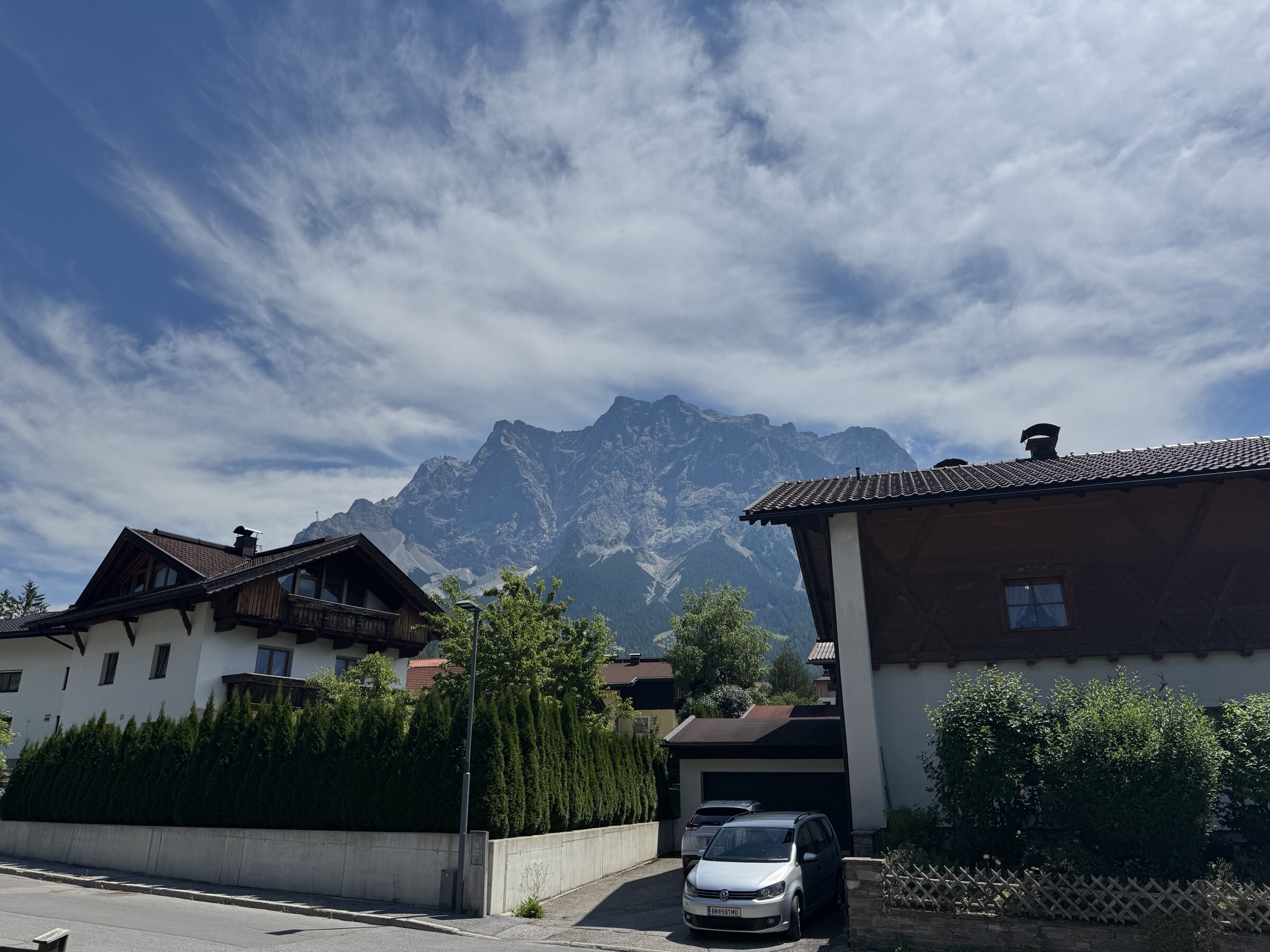 Aan de voet van de Zugspitse. Wegtrekkende sluierbewolking richting oosten.