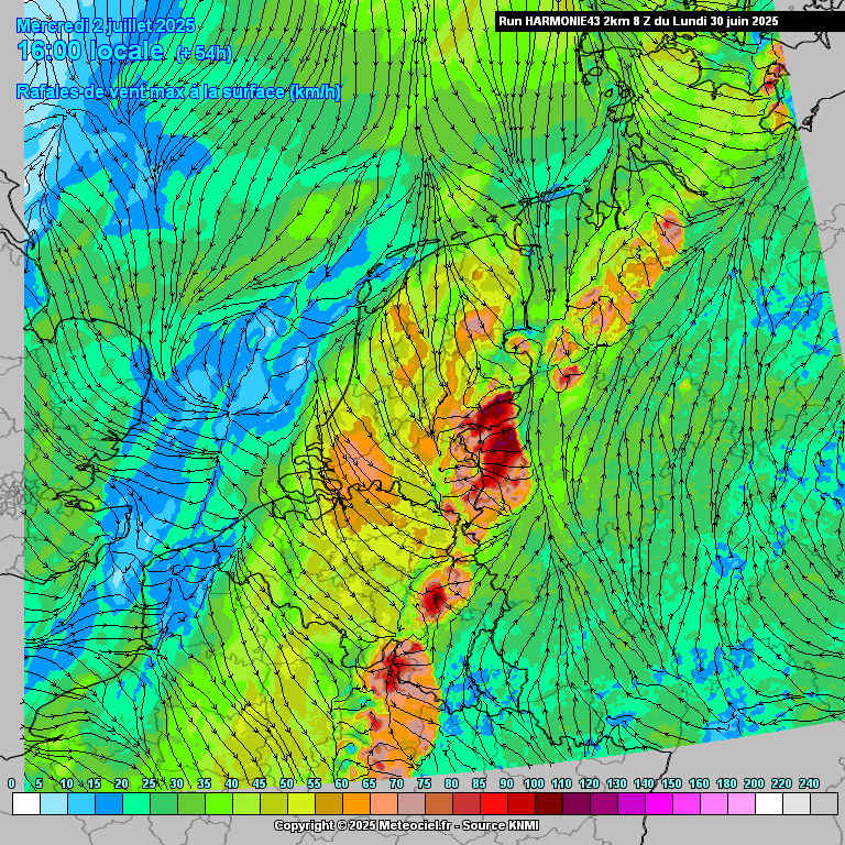 De trekrichting van de buien is zuidwest-noordoost. Maar aan de grond klapt de wind om van zuidoost naar noordwest. De berekende windstoten verplaatsen zich hierdoor bij Harmonie meer van west naar oost. Harmonie berekent trouwens vaak te hoge windstoten. Hier twee kaarten met twee uur ertussen.