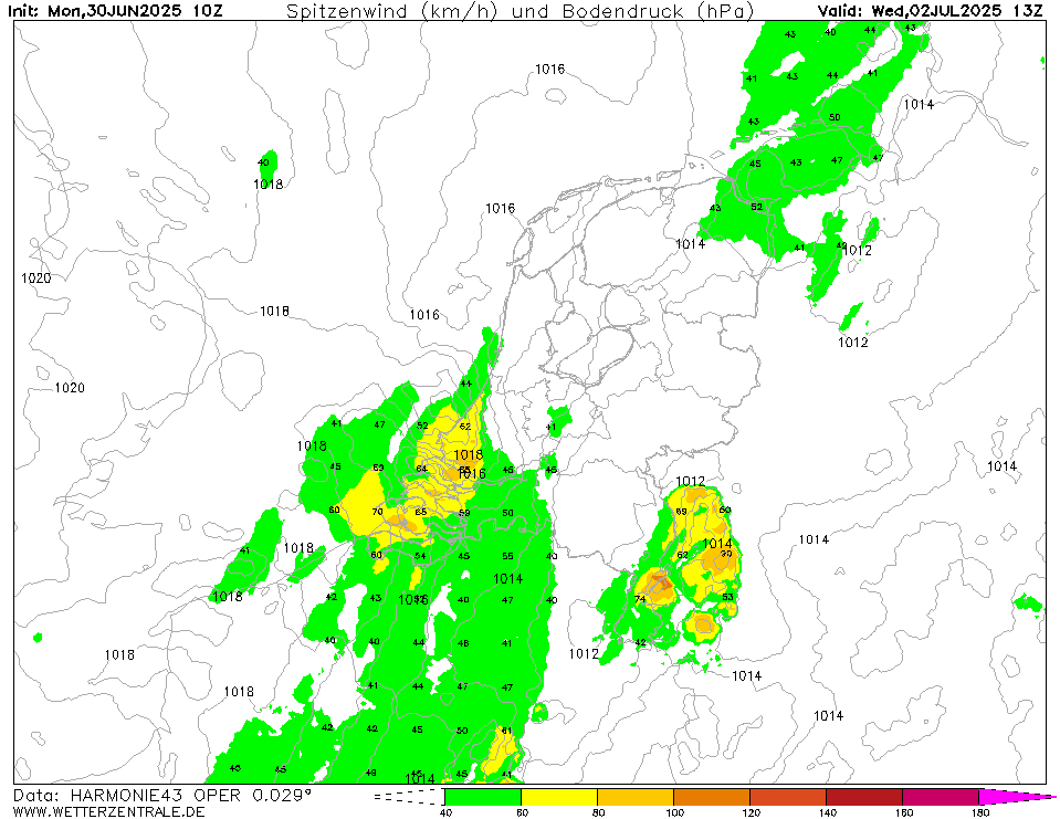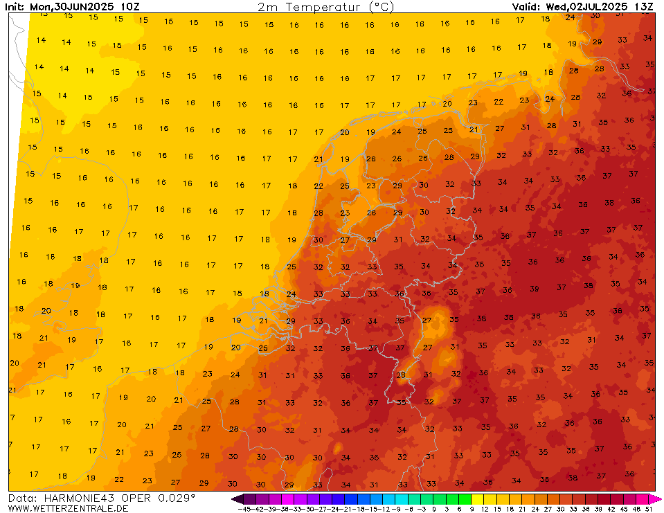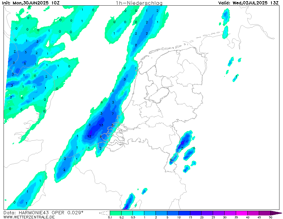 Het gaat om buien die advectief binnenkomen vanuit Frankrijk. Afgelopen runs van Harmonie waren er ook al buien op de Noordzee te zien, maar meestal niet zo dicht op de kust. De noordwester lijkt ook minder hard binnen te vallen (zie animatie). Even kijken hoe dit zich ontwikkelt. De buien worden vermoedelijk niet vanaf de grond gevoed.