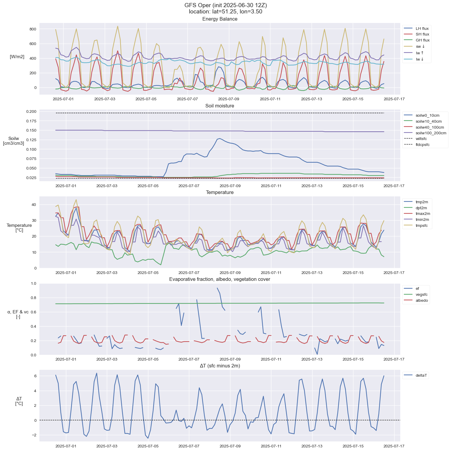 Uiteraard is het droog daar, maar dat geldt ook voor omliggende gridcellen die een wat normalere (wat mij betreft) hydraulische eigenschappen hebben. En zelfs die lijken mij ook iets droger dan het in realiteit is. Continu in de buurt van wilting point zitten, met verdampingsfracties van rond de 0.2 (inc open water, irrigatie, tuintjes etc) impliceert dat alle natuurlijke en niet-geirrigeerde vegetatie op sterven na dood moet zijn. Dat is het punt waarop bomen massaal bladeren laten vallen etc. Zo ver is het nog niet volgens mij, dan was dat wel op WW langsgekomen denk ik. Het komt ook niet overeen met het albedo van onder de 20% waar GFS meerekent (dat lijkt mij een klimatologische waarde).