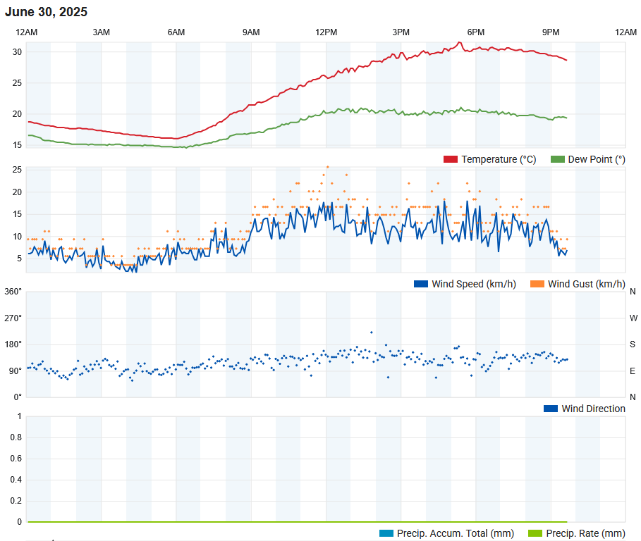 Mooie paraboolvorm in de temperatuur hier vandaag. De Tx van 31,5°C werd bereikt tijdens een korte warmtepiek die lijkt te zijn ontstaan door een tijdelijke terugval in de windsnelheid.