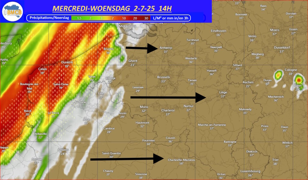 Morgen, woensdag, slaat het weer plots om. Vanaf de kust ontwikkelt zich in de namiddag een actieve onweerszone, die zich razendsnel landinwaarts verplaatst. Hevige windstoten tot 110 km/u, lokale hagelbuien en intense regenval in korte tijd worden verwacht.