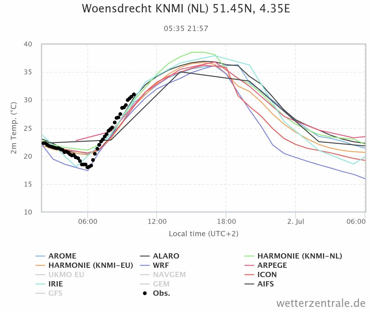 Maar waarschijnlijk zal het de komende uren wel wat gaan afvlakken. Zou je de voorsprong op Harmonie doortrekken naar vanmiddag, komt Woensdrecht uiteindelijk uit op 39,7 graden.