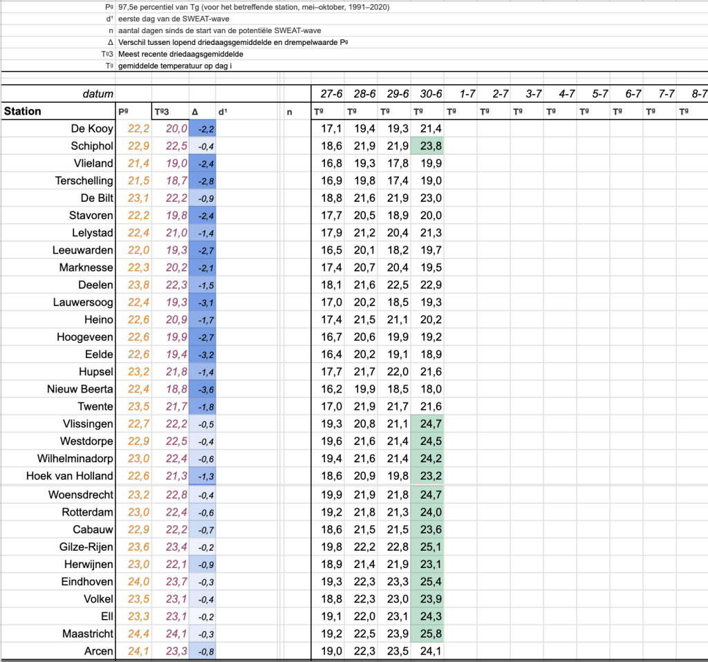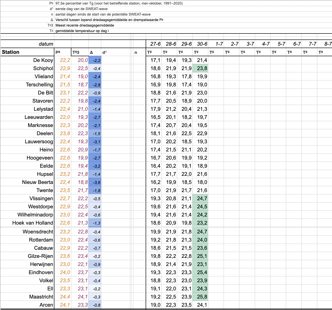 Hieronder het meest actuele overzicht van de SWEAT-index*. Op een aantal weerstations is gisteren de drempelwaarde gehaald, met name in de zuidoostelijke helft van het land. In de andere helft zorgde met name de frisse nacht voor lagere daggemiddeldes - en daarom ook minder hittestress. Nog geen enkel station haalt een driedaagsgemiddelde boven de drempelwaarde, dus er is nog geen sprake van een SWEAT-wave, maar dat zal met vandaag erbij wel anders zijn.