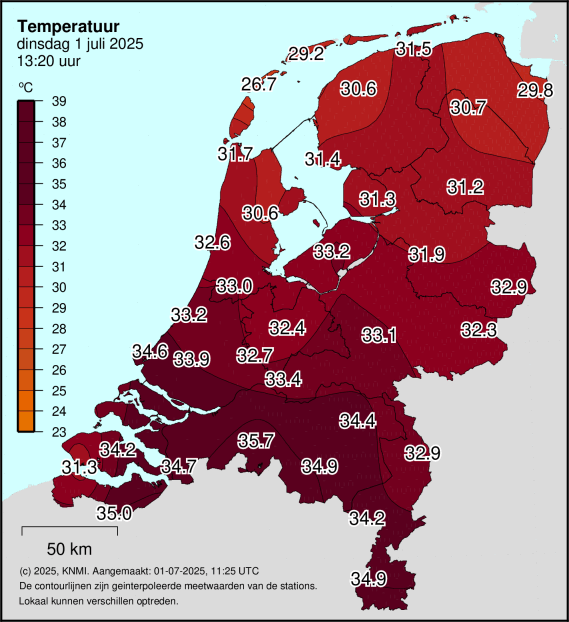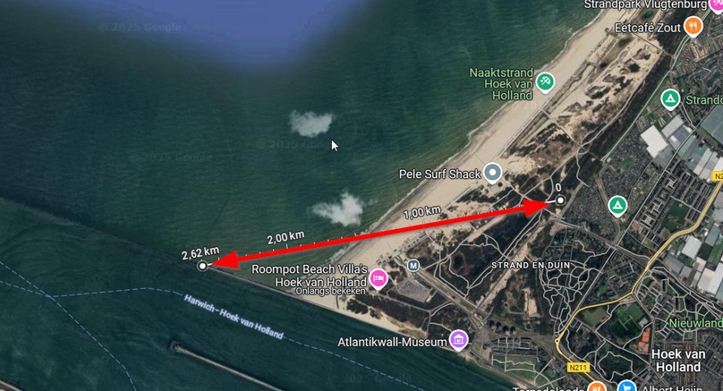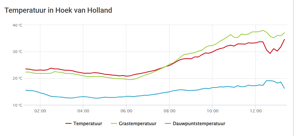 Het zeewindfront ligt precies tussen het duinstation en de windpaal op de Hoekse Pier. Vandaar dat de windrichting nog naar het noorden wijst, terwijl op het duinstation de temperatuur weer gestegen en het dauwpunt weer gezakt is.