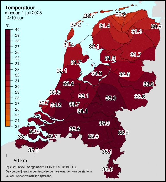 Temperatuurstijging vlakt af, al een uurtje tussen de 35 en 36 graden