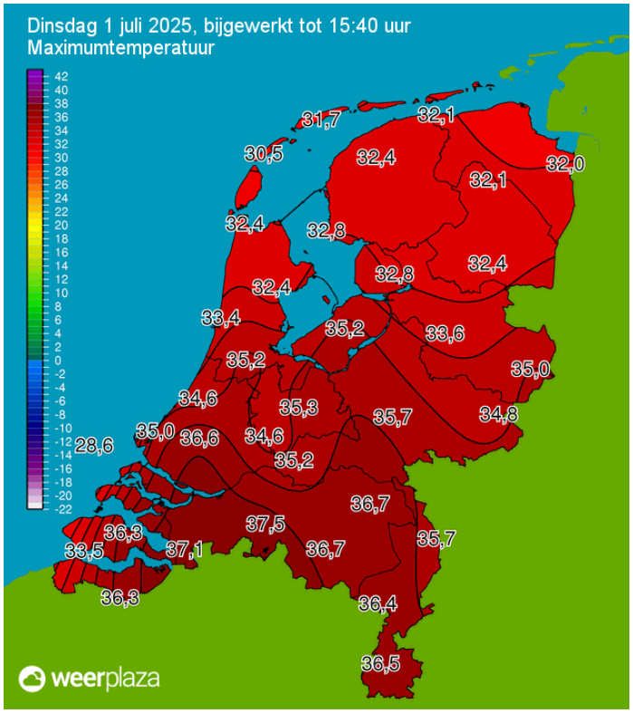 Rotterdam tot nu toe: 36,6°C. Bijna op een record.