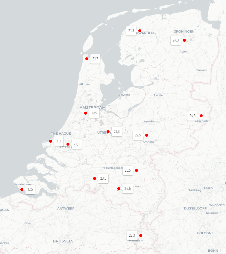 Dat zit ook dicht tegen records aan. Record staat op 25,5°C in 1964 op station Volkel. Maximum was toen 31,3°C.