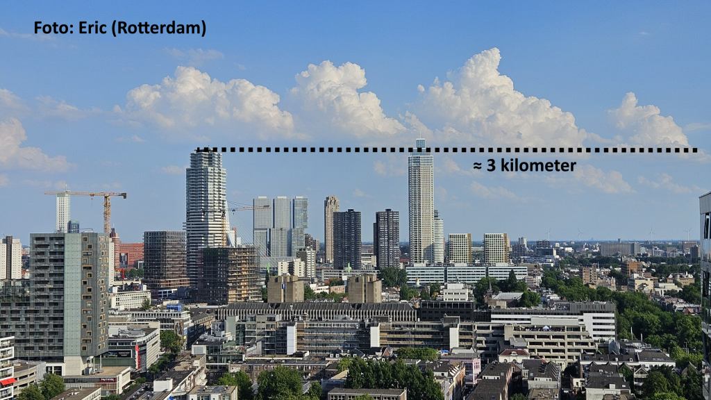 Een voor de Benelux erg ongewoon beeld vanmiddag. Door de zeer warme luchtkolom konden opstijgende luchtbellen tot grote hoogte stijgen. Op een hoogte van 3 kilometer vond enige condensatie plaats, waardoor cumulus ontstonden. Die hadden de basis op veel plekken tussen de 2,5 en 3 kilometer liggen! Iets dat je normaal gesproken eerder ziet in Nevada of Arizona.