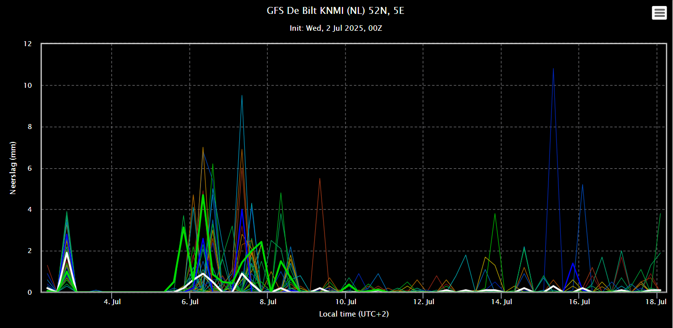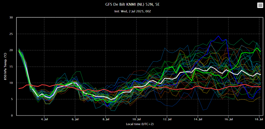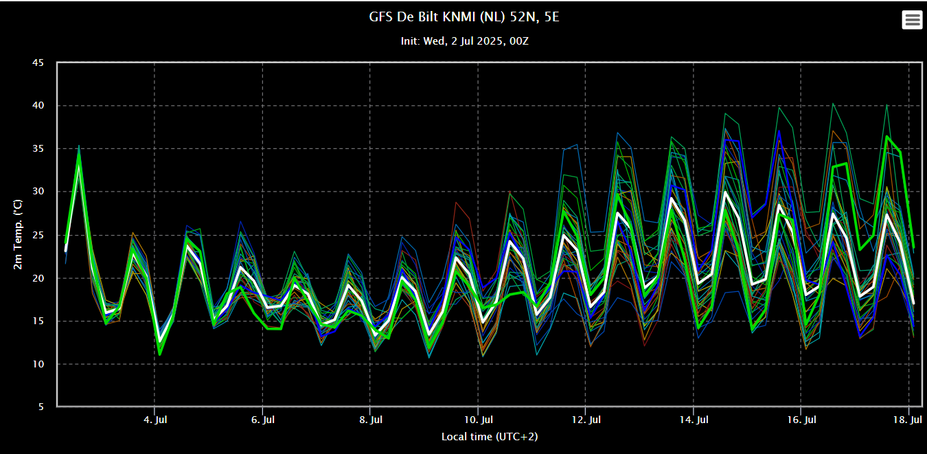 Is nog ver weg, maar het gemiddelde van GFS ziet een mooie doorstart van de zomer wel zitten. Oper zit ook bij de warme leden.