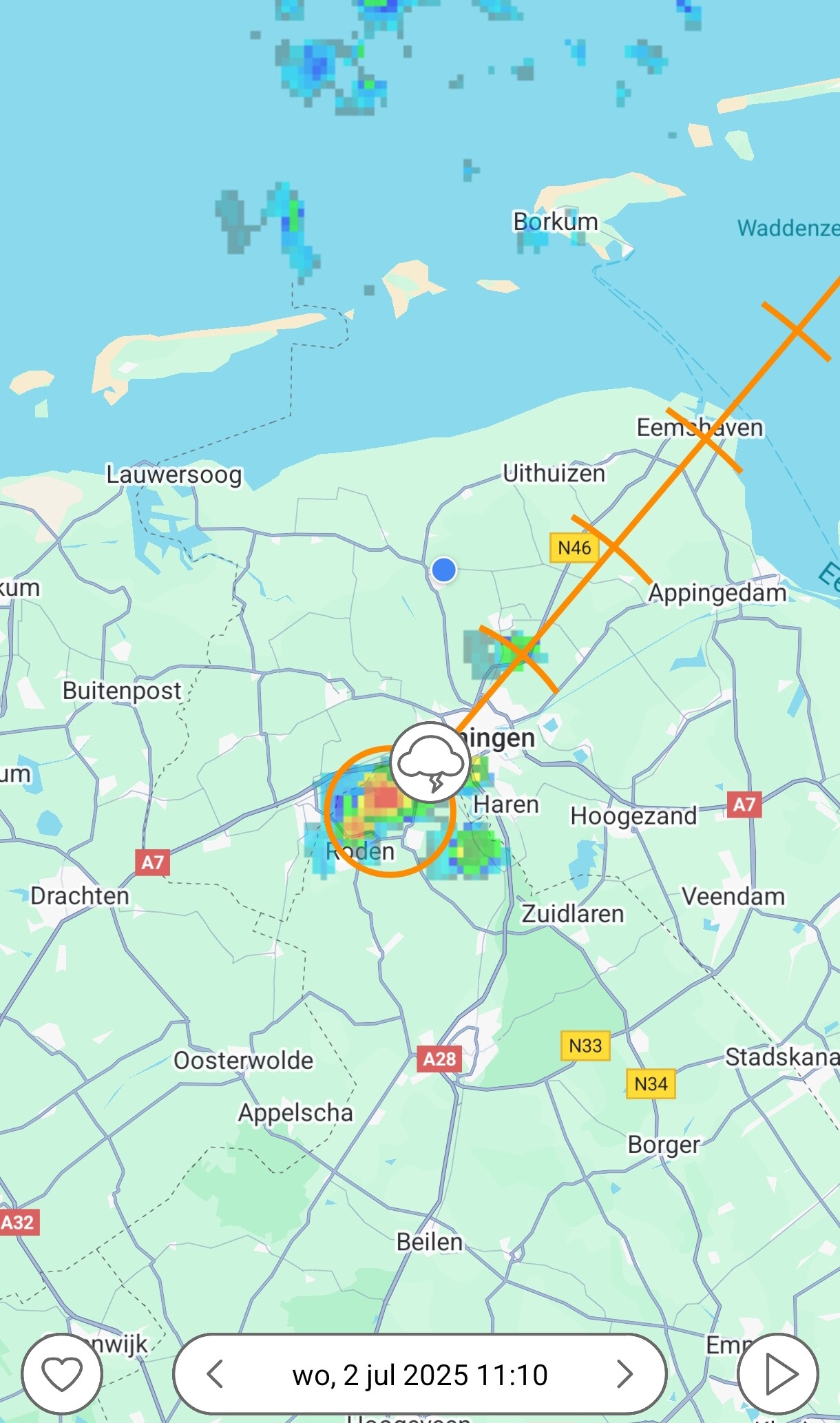 Je hebt gelijk. Er is een bui ontstaan nabij de stad Groningen. Zal dat de reden zijn?