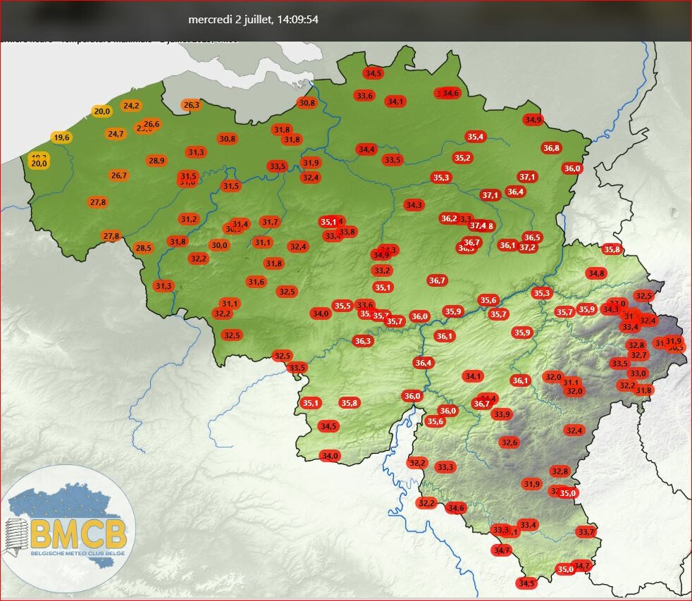 België, 14u: de temperatuur overschrijdt op sommige plaatsen 35°C (en plaatselijk zelfs 37°C (!)), waaronder in het centrum van Brussel, in Limburg, in Waals-Brabant, in de provincie Namen en vooral in de valleien van de provincies Luik en Luxemburg.... Terwijl over West-Vlaanderen en meer bepaald de kuststreek men slechts 19 à 22° noteerd!