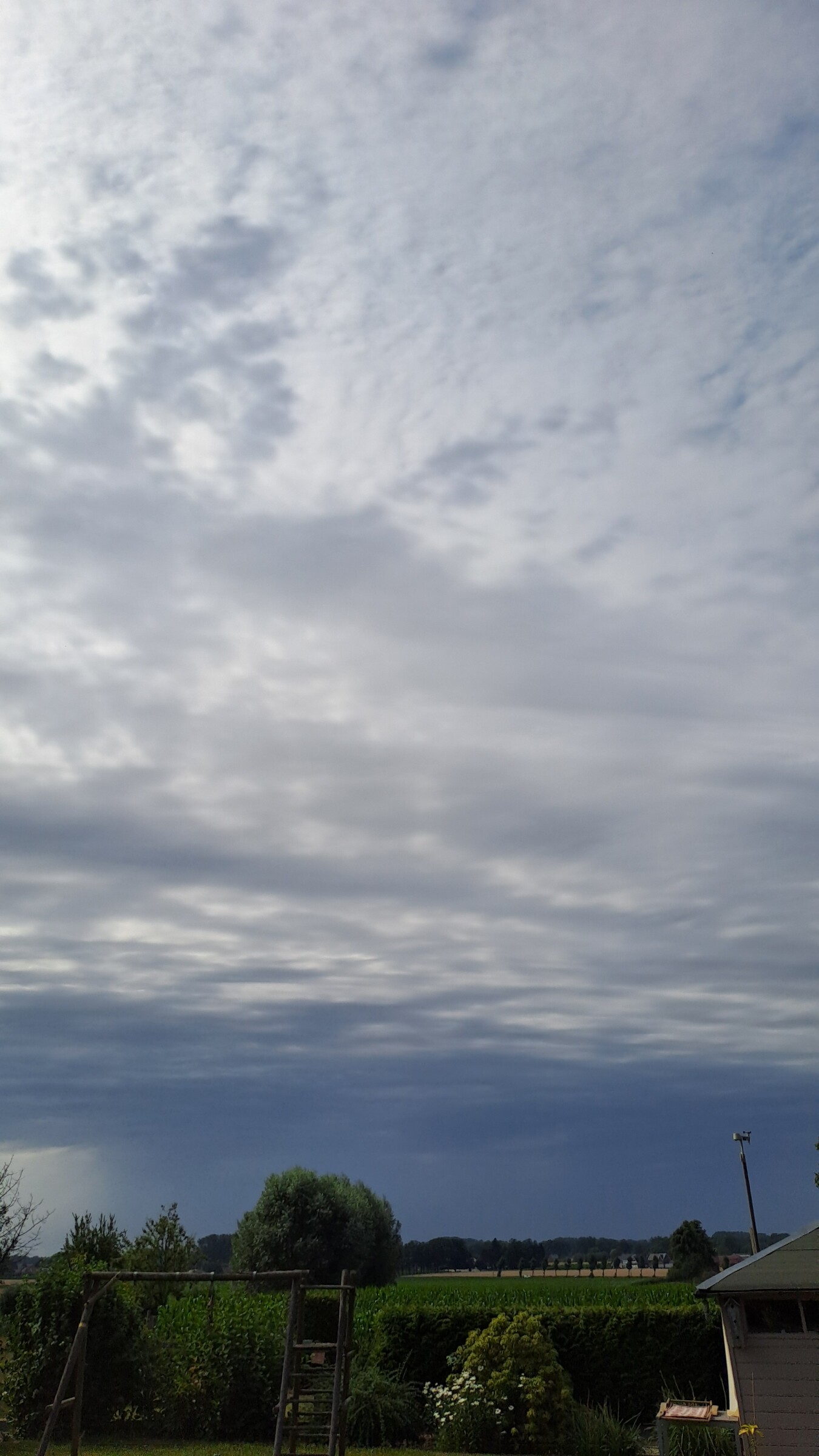 De regen en buien passeren heel ver ten O maar heel dicht ten westen, je kan ze bij manier van spreken voelen.