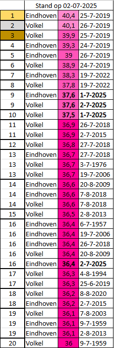 Recente metingen van de KNMI-stations Volkel en Eindhoven vetgedrukt. Het was/is een hitteoffensief dat wat mij betreft vergelijkbaar was met de memorabele hittegolf van precies 10 jaar geleden, in het begin van juli 2015. Op een bepaalde manier vond ik 2 juli 2015 ook wel een zenuwslopende dag, omdat toen het hitterecord van Warnsveld (38,6 graden) in Limburg bijna werd verbroken. Vandaag was alweer dag nummer 5 waarop ergens in Nederland een temperatuur boven die voorheen mythische grens van 38,6 graden werd gemeten.