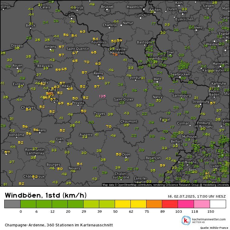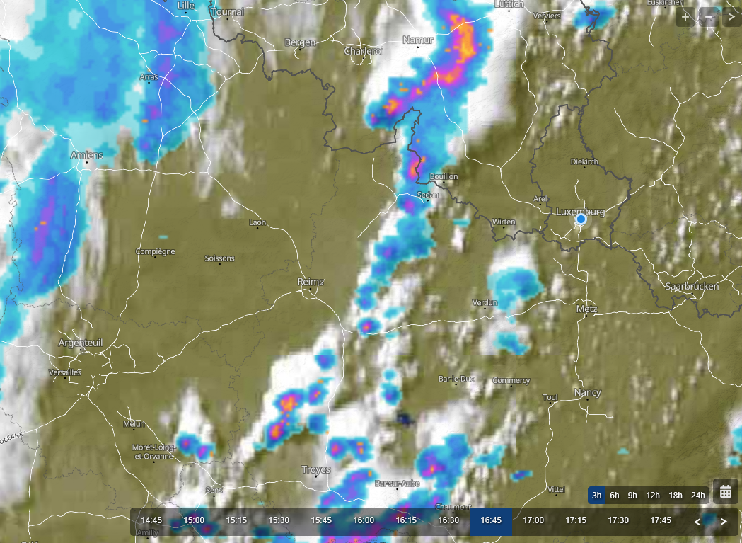In noordoost Frankrijk is op station Châlons-Vatry (Champagne) tussen 16 en 17 uur een windstoot gemeten van 135 km/u. Wat zou daar gebeurd zijn? Daar (ten zuidoosten van Reims) ontstond tegen 16:45 even een pitje, dat meteen daarna weer weg was. Zie de tweede afbeelding.