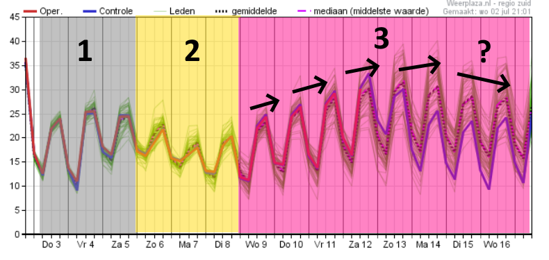 3) Opbouw nieuwe Azorenrug die steeds noordoostelijker schuift. Potentieel herhaling van zetten. Zeer warme lucht op transport. Als de rug er komt is de vraag vooral: wanneer volgt de afbraak? Wanneer kan de zeelucht weer binnenstromen? Vandaar het vraagteken. Droog, veel zon.