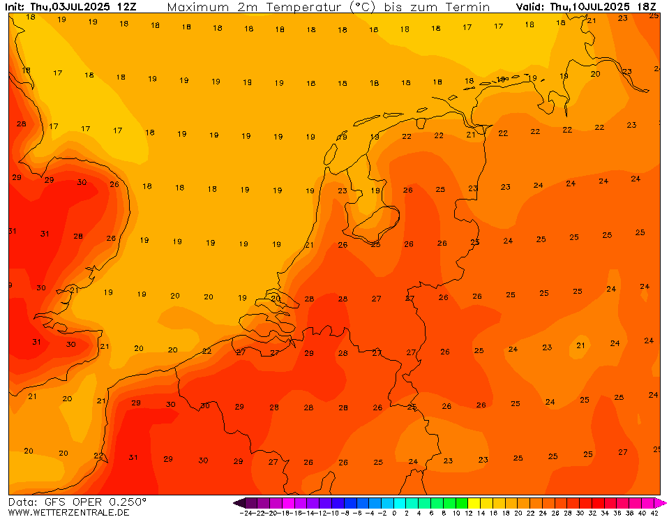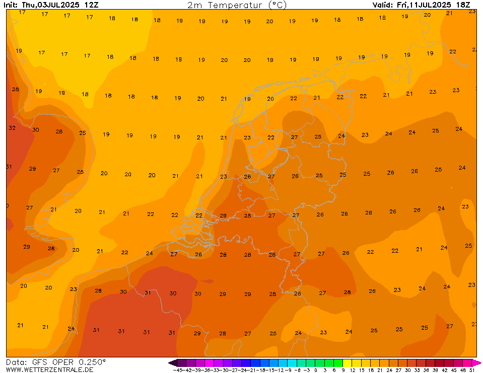 Oper GFS0312: do en vrij op veel plaatsen zomers, lokaal tropisch