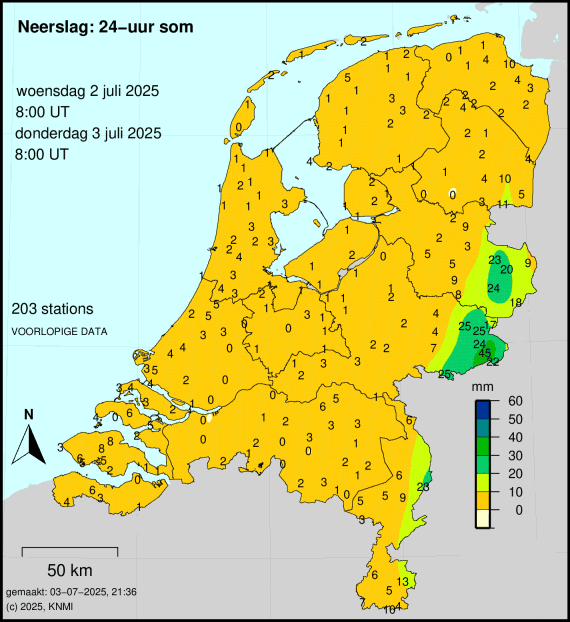 Dat is dan waarschijnlijk de hoogste neerslagwaarneming bij het KNMI. Waarnemer Hengelo 24 mm, zelf zat ik hier op 24,4 mm.