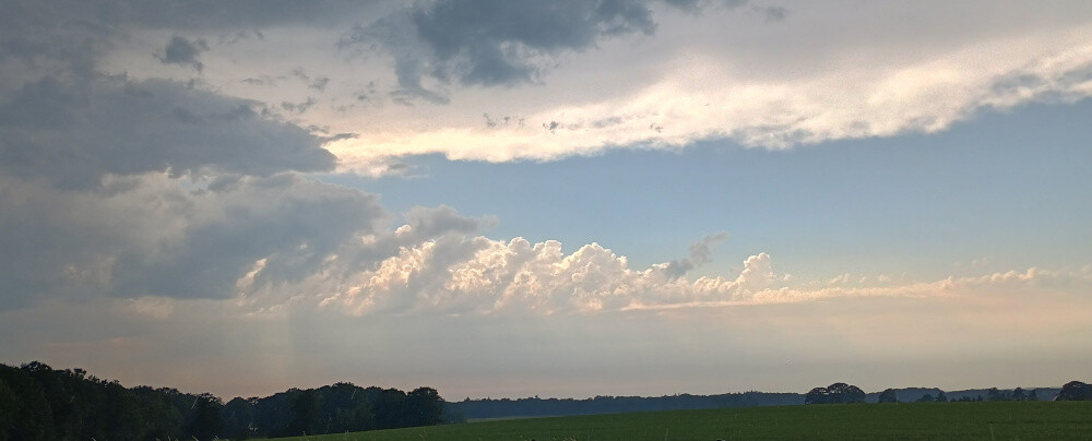 Daarentegen zie je dat groeiende kanteeltjes een typische windshear-vorm aannemen: schuin naar boven overhellend in de richting van de wind, die op hoogte sterker is. Dat geeft me de indruk dat het toch om 'gewone' castellanus gaat, aangezien inflow de andere kant op zou gaan, richting bui.