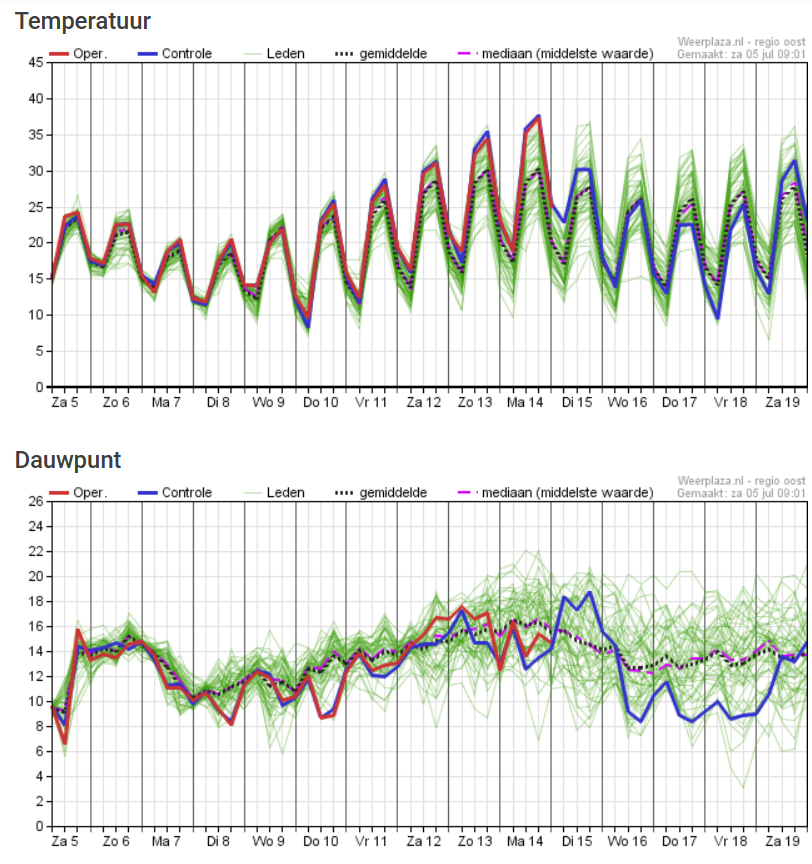 De eerste dagen is het gewoon fantastisch wandelweer. Donderdag en vrijdag dan weer oplopende temperaturen en dan is het zaak op tijd te finishen voor de lopers die de warmte niet zo goed verdragen. Het dauwpunt blijft wel redelijk laag.