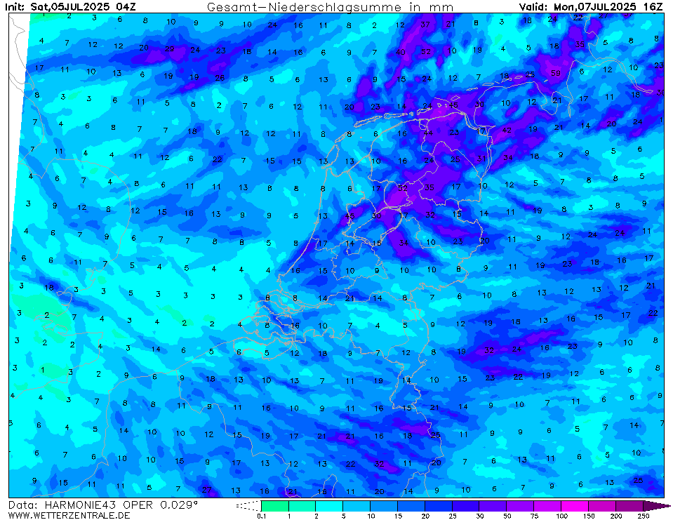 geeft heel aardige hoeveelheden voor het ruime noordoosten. 20 - 50 mm maar liefst tot 60 uur vooruit. De tendens hiervoor is redelijk consistent.