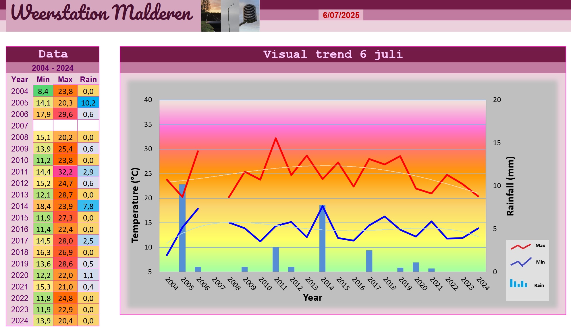 We zijn tijdens de nacht in onstabiele vochtige lucht terecht gekomen waardoor het klam aanvoelde met minima van 14,5 graden en er veel bewolking hing. Het ging vooral om Altocumulus floccus en castellanus velden waaruit zich hier en daar stapelwolken ontwikkelden. Er waren ook flinke valstrepen onder te zien en de wolkenpaketten zagen er hier en daar behoorlijk dreigend uit. Voorlopig bleef het wel droog in Malderen al is het zeker niet uitgesloten dat er hier en daar al wat neerslag viel uit de dikste valstrepen. Vanuit het zuid- zuidwesten kwamen er meer wolken onze richting uit en volgens de radar zat daar voorbij de Franse grens zelfs al wat licht onweer op. Tijdens de namiddag werd echter snel duidelijk dat Londerzeel haar vitaliteit en uitstraling heeft teruggevonden, want de onweersgolf verloor terug haar activiteit toen ze in de buurt kwam en ook tijdens de avond was er geen enkele bui die in de buurt durfde te komen. Wat we wel kregen was regen uit aambeeldbewolking en afstervende cellen wat uiteindelijk toch nog goed bleek te zijn voor een totaal van 2,5 mm aan het vloeibare goud. Tussen de twee buienlijnen door warmde het op tot een zwoele 28,0 graden bij een zuidoostelijke wind waarbij we aan de wolken konden zien dat de wind met de hoogte naar het westen ruimde en dus een potentieel gevaarlijke situatie veroorzaakte voor eventuele supercells. Uit de tweede onweersgolf kregen we in Malderen dan toch nog het privilege om enkele donderslagen te horen, maar dit moesten we dan wel betalen door neerslag in te leveren zodat de bijhorende bui beperkt bleef tot een aantal niet- meetbare druppels (maar het waren er wel dikke). Maar misschien was het wel beter zo aangezien het in het uiterste westen tot flinke hagel kwam met de nodige schade erbij. De gemiste onweerskansen werden bovendien ruimschoots goed gemaakt door prachtige wolkenformaties die in vurige tinten oplichtten inclusief mammatusbewolking. Dit alles werd mooi gedecoreerd en afgewerkt door Altocumulus floccus wolkjes en in tegenstelling tot degenen die met het onweer 'verwend' werden konden we vanuit Malderen de hele avond blijven genieten van de uitzichten in droge en zeer zachte omstandigheden. De wind viel weg en we sloten af met het eerdergenoemde neerslagtotaal en dreigende aambeeldbewolking in het zuiden.