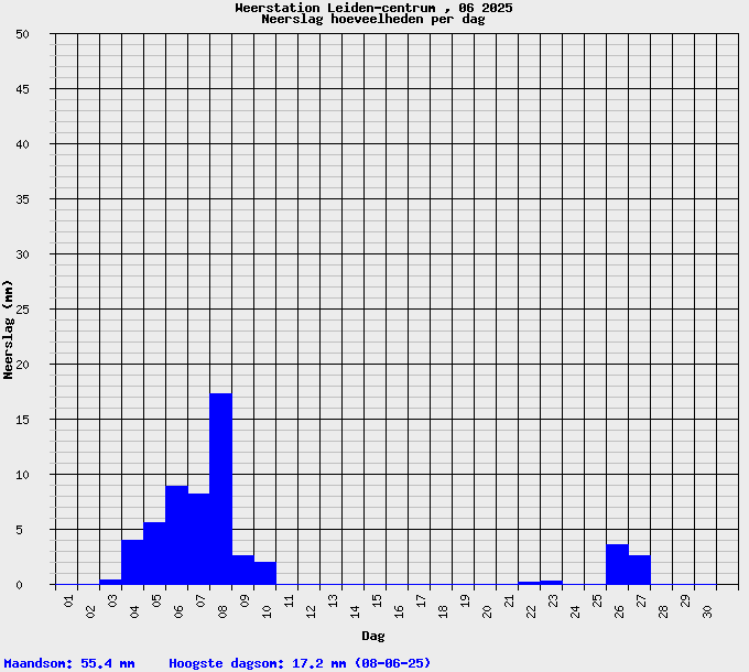In juni viel hier 55,4 mm tegen een normaal van 59,2 mm zodat gesteld mag worden dat dit vrijwel de normale hoeveelheid neerslag is, waarbij de eerder genoemde 1e decade vrijwel de gehele maandsom voor zijn rekening nam.