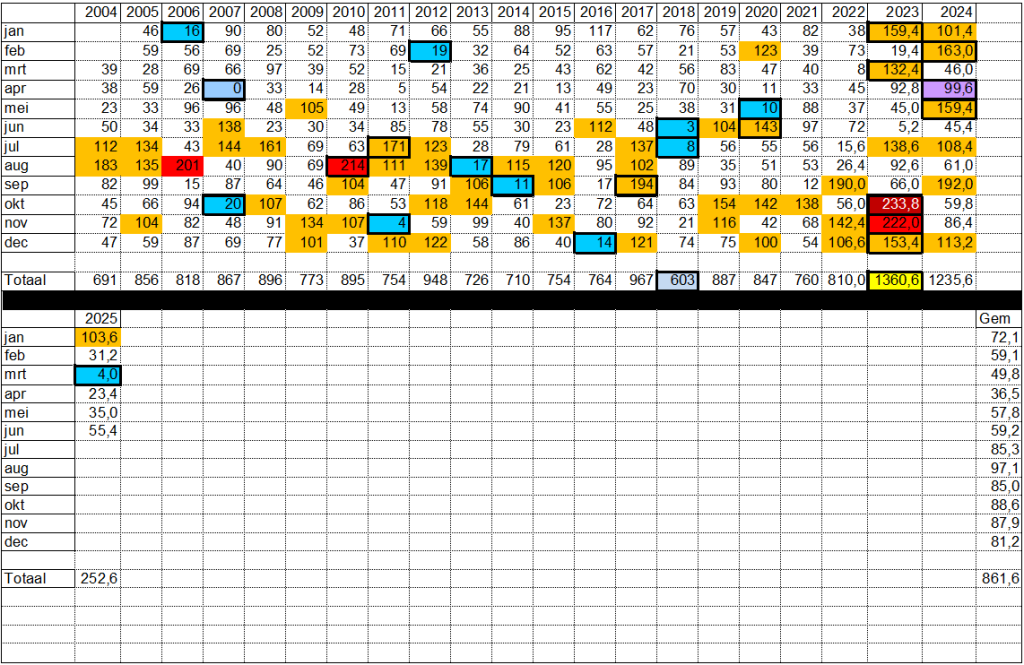 Maar de onderbouwing staat er bij en daar kan ik nog aan toevoegen dat in de eerste 6 dagen van juli, hier alweer 29% van de normale maandsom is gevallen aan neerslag (N=85,3 hier voor juli)