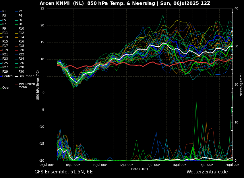 Wat we daarvoor bespraken was natuurlijk maar een enkele Oper run. Het ensemble geeft meestal een veel helderder beeld. En ja hoor, de Oper valt ten opzichte van de rest van de leden enigszins uit de toon op termijn met lagere maxima. Meeste leden zitten veel hoger. Maar er blijft een maar. Want hoewel de meeste leden inderdaad droog zijn zie je ook een clustertje die wel degelijk met nieuwe neerslag komt volgende week. Vaak ook koelere opties. Bovendien laat AIFS nu ook fikse neerslag signalen zien na een mooie zomerweek. Afwachten hoe dit verder evolueert.