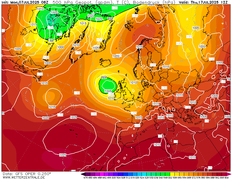 Correctie: driedubbele dreiging. Zowel uit het oosten als uit het westen in de vorm van koudeputten, hoogtelagen en als je niet uitkijkt uit de kluiten gewassen zomerdepressies die vanaf de Britse eilanden dichterbij schuiven doordat hogedruk boven onze omgeving de grip geleidelijk verliest.