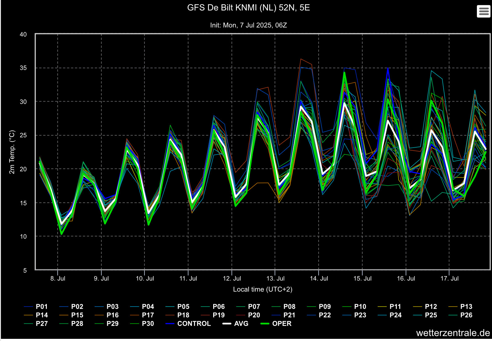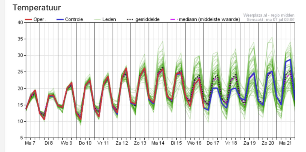 Het gemiddelde van GFS is rond de 30 op MT en bij ECMF is dat toch wel 5C koeler. Enig idee hoe dat kan?