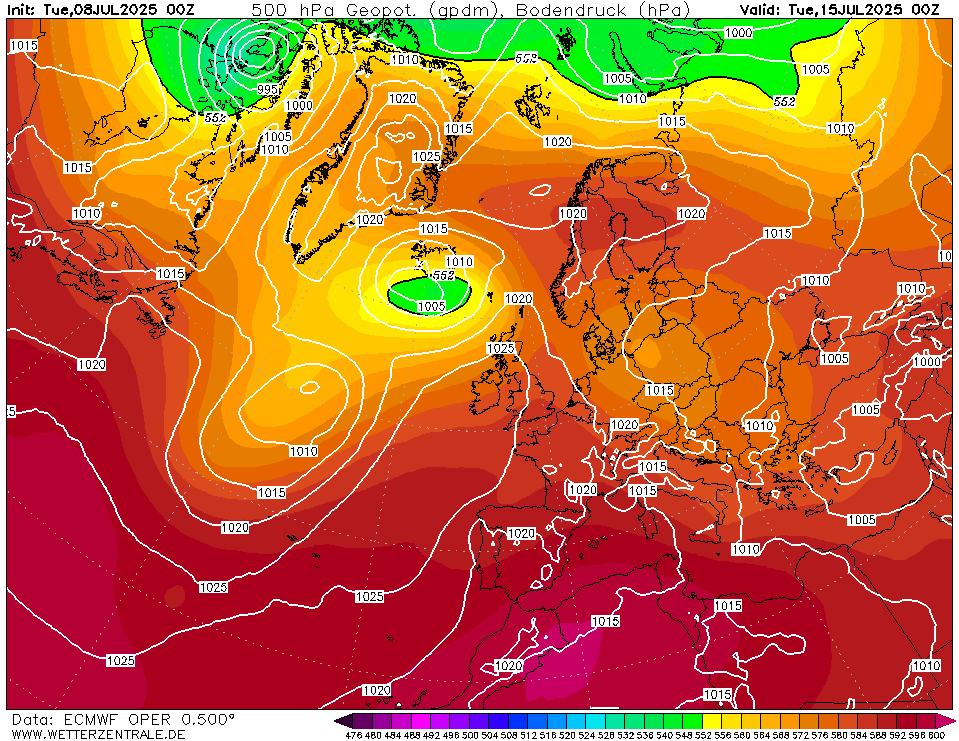 Het wordt tijd dat die hoge noorderlingen ook wat lekker weer krijgen, en dat gaat ook gebeuren. Hierdoor (hogedruk focus verder bij ons vandaan dan eerder voorzien), zullen talloze regio’s in Scandiland zomerse tot tropische waarden kunnen gaan noteren. De échte zomer strekt zich verder uit zuidwestwaarts. Met high class zomerweer in Engeland (33 graden in Londen en 23 in Leeuwarden als u geluk hebt). Ook grote delen van Frankrijk goed toeven. Meer naar het noordoosten toe koudeputjes en buien. Vooral Polen zal hierdoor geraakt worden. Ook de Balkan kan noodweer verwachten door de toenemende lagedruk die binnensluipt door de constellatie.
