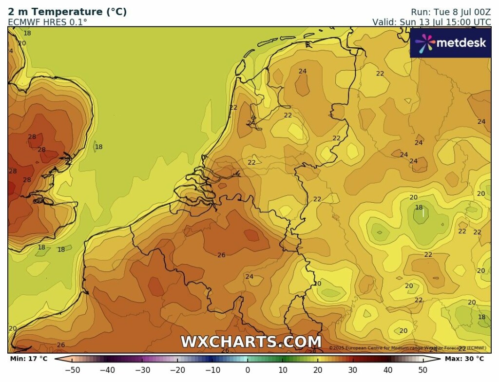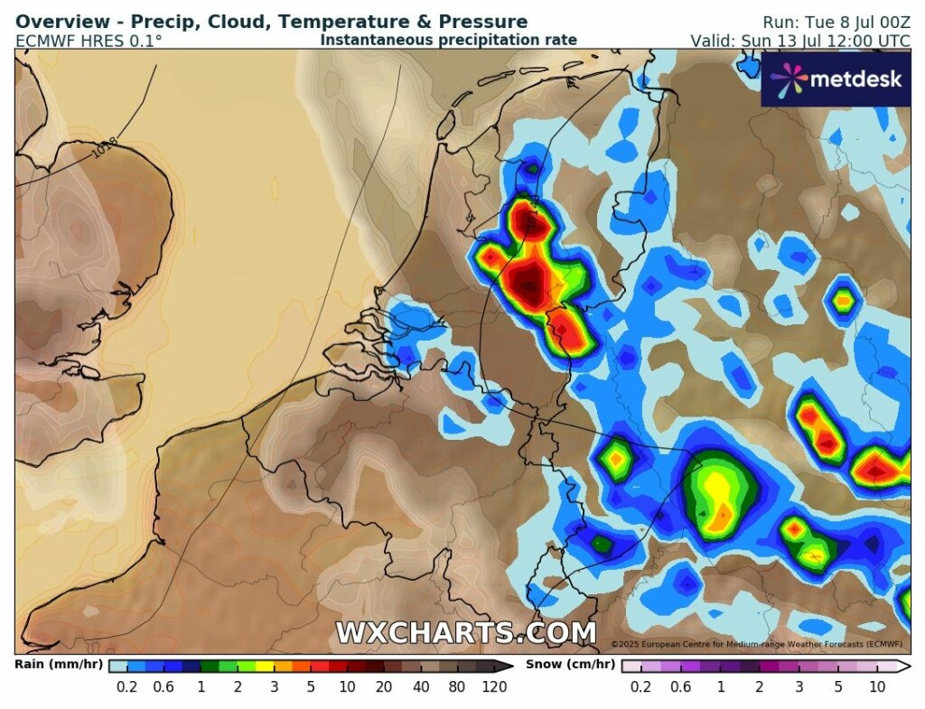 Beetje verrassende optie eigenlijk. Maxima plaatselijk tot 25 C, maar in buien veel lager...