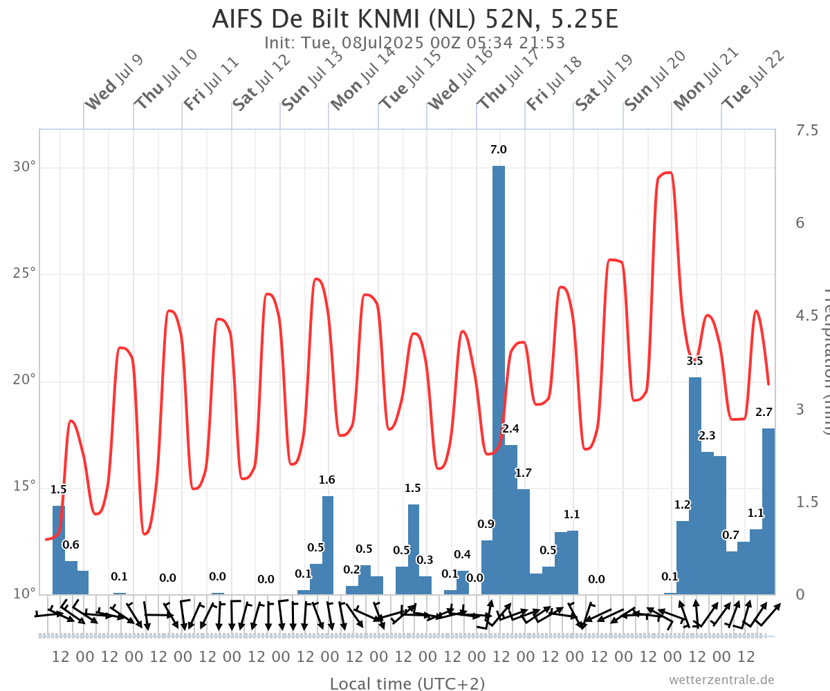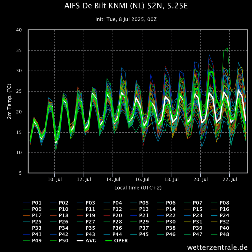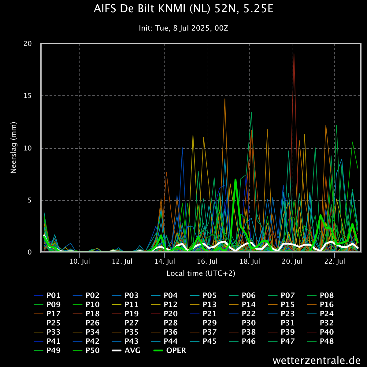 Het AI model van ECMWF lijkt me nog altijd wat gematigder dan ECMWF en vooral GFS, met een "dipje" in temperatuur begin volgende week. In het diagram van de operationele run en het neerslagensemble is goed te zien dat daar ook de nodige wisselvalligheid bij berekent wordt, wat ook al uit de weerkaarten te halen viel.