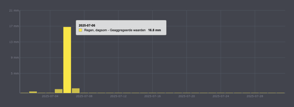 Het is een komen en gaan van buien hier, vandaag 8,0mm, juli 38,2mm