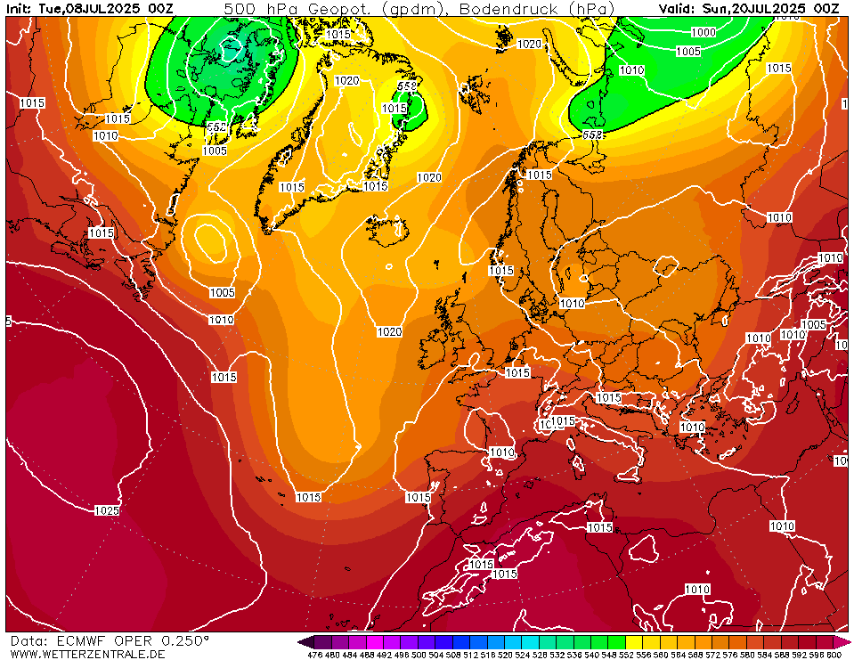 tussen AIFS en GFS, zij het met een andere uitwerking doordat het laag bij AIFS een veel grotere/wisselvalligere invloed bij ons uitoefent zoals je terecht stelt. Als je de kaarten op 20 juli die je toont vergelijkt met ECMWF voor die dag, dan zie je dat ECMWF daar toch wel behoorlijk van afwijkt met juist een hoog (of uitloper daarvan) op de plek waar GFS en AIFS een laag hebben: