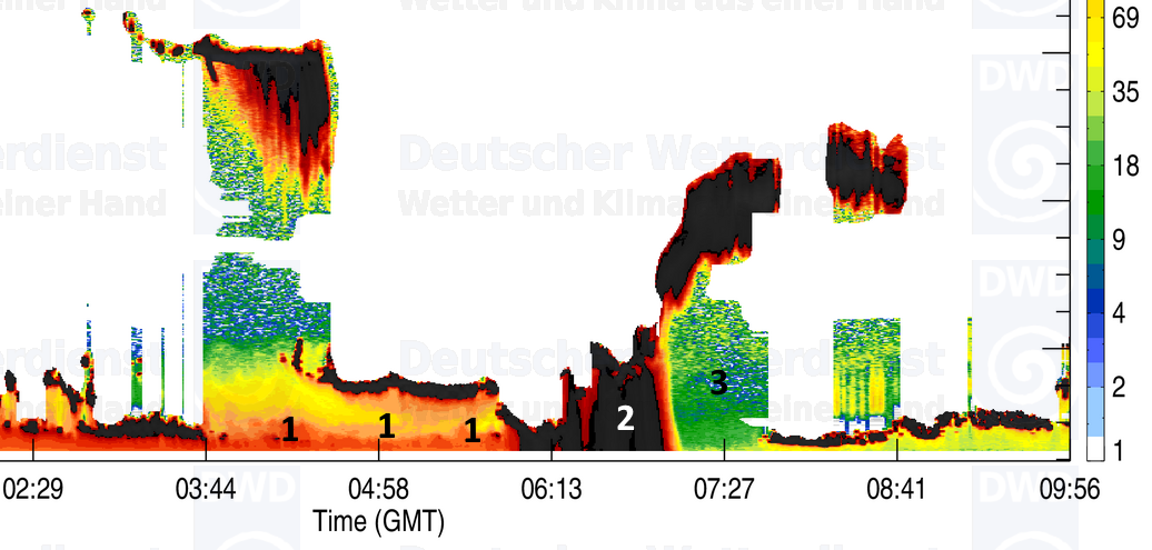 Zodra bij (3) de regen stopt, zie je dat de grenslaag (onderste 1500 meter atmosfeer) schoongespoeld is. Er is veel minder geel/rood te zien, het aantal aerosolen is sterk gereduceerd. De regen heeft ervoor gezorgd dat er sprake is van 'natte depositie: de luchtverontreiniging is door de regen uit de grenslaag verwijderd. De regen heeft dus letterlijk voor doorademweer gezorgd! Je ziet dit effect ook bij een scherpe overgang tussen luchtsoorten (van continentaal naar maritiem).
