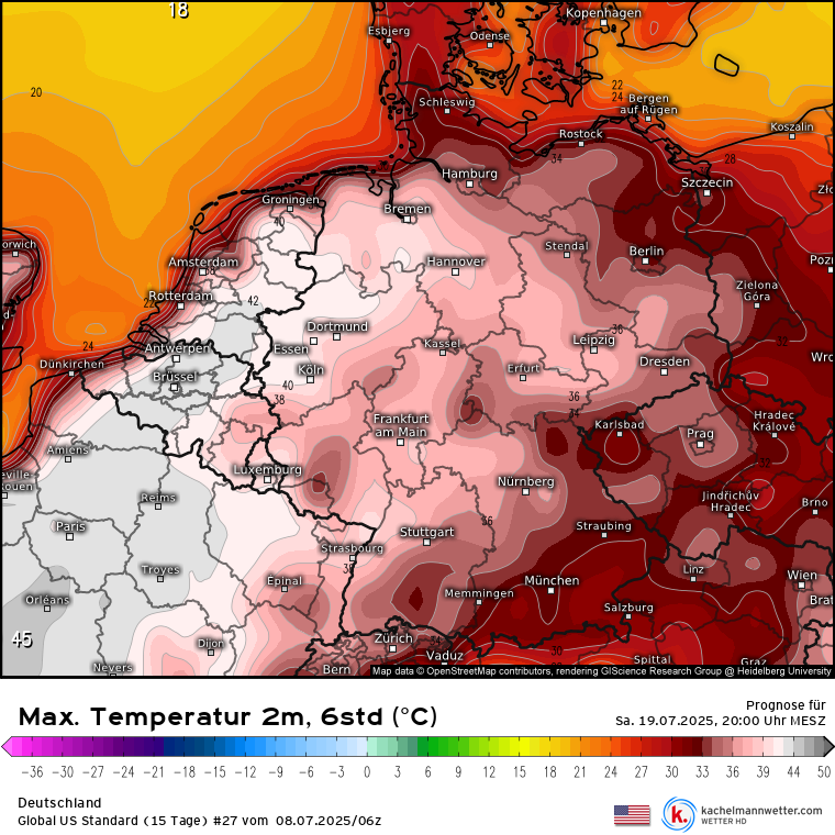En dat levert dan temperaturen op tot 42 graden aan de grond. Trouwens op dezelfde datum waarop het in 2022 bijna 40 graden werd: 19 juli.