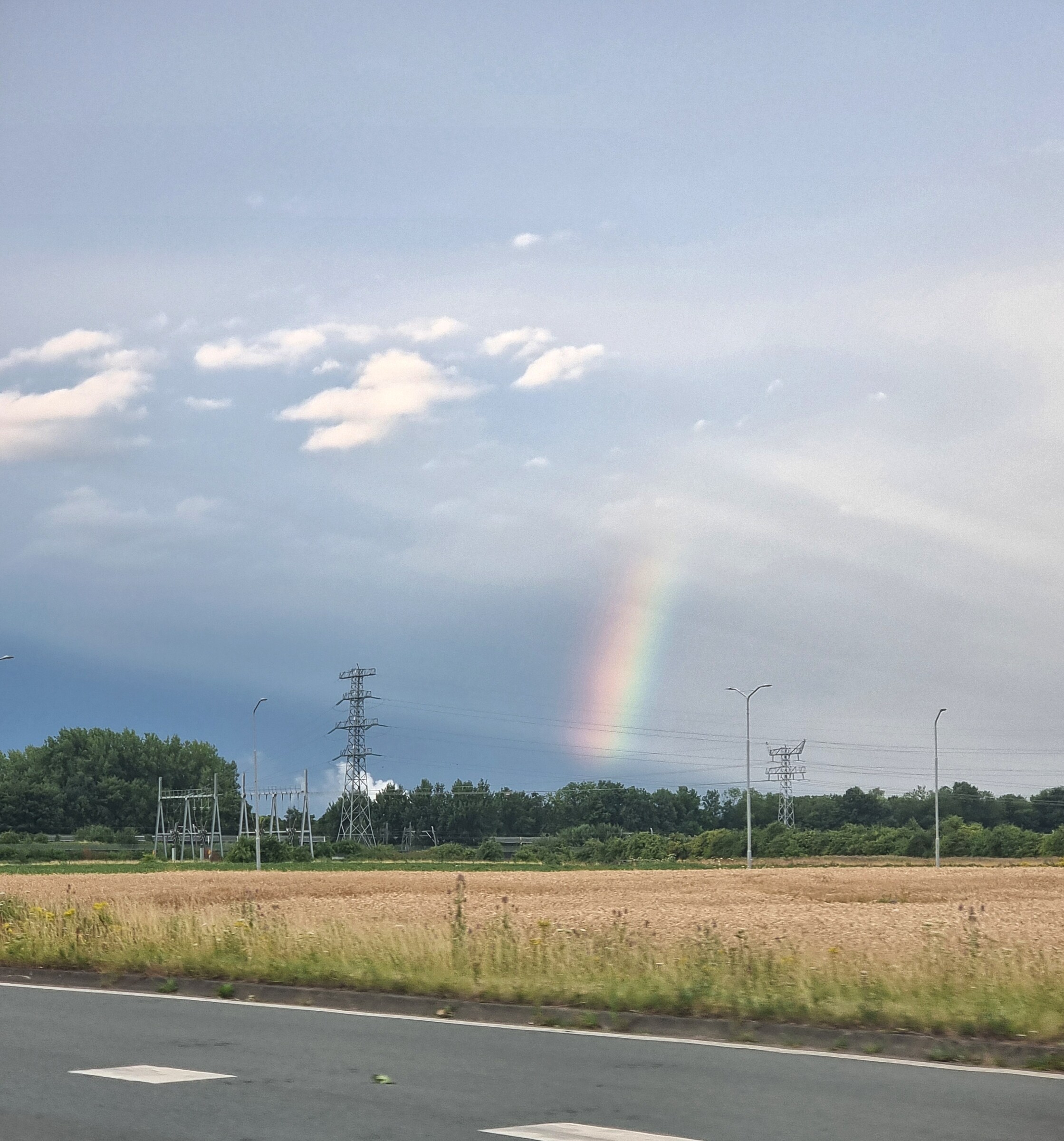 Apart gezicht vanochtend om 06:20 met een gedeeltelijke regenboog zonder regen. Door de laagstaande zon blokkeert de schaduw van het van der Valk hotel het onderste stukje van de regenboog volgens mij. Het is ook lastig te zien of de achtergrond een grote wolk is of de ochtendhemel.