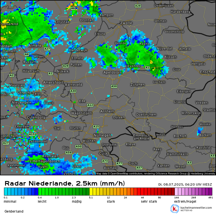 Je kijkt naar een bui bij Den Bosch, dus ik denk dat dit de verklaring is. Het is wel een eind weg.