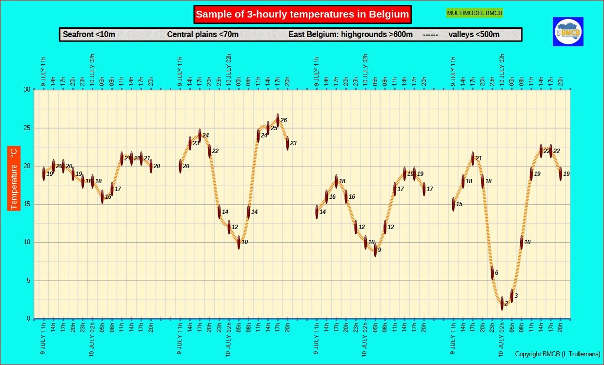 De maxima liggen tussen 23 en 25°C in de lage gebieden, 20 à 23°C aan zee, en 18 tot 23°C ten zuiden van Samber en Maas.