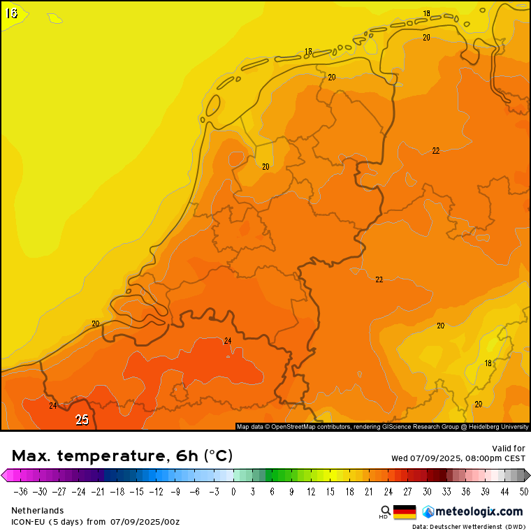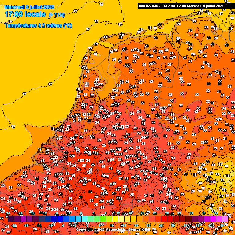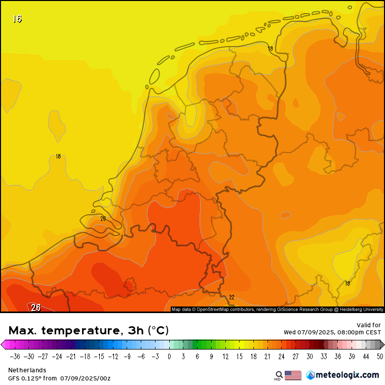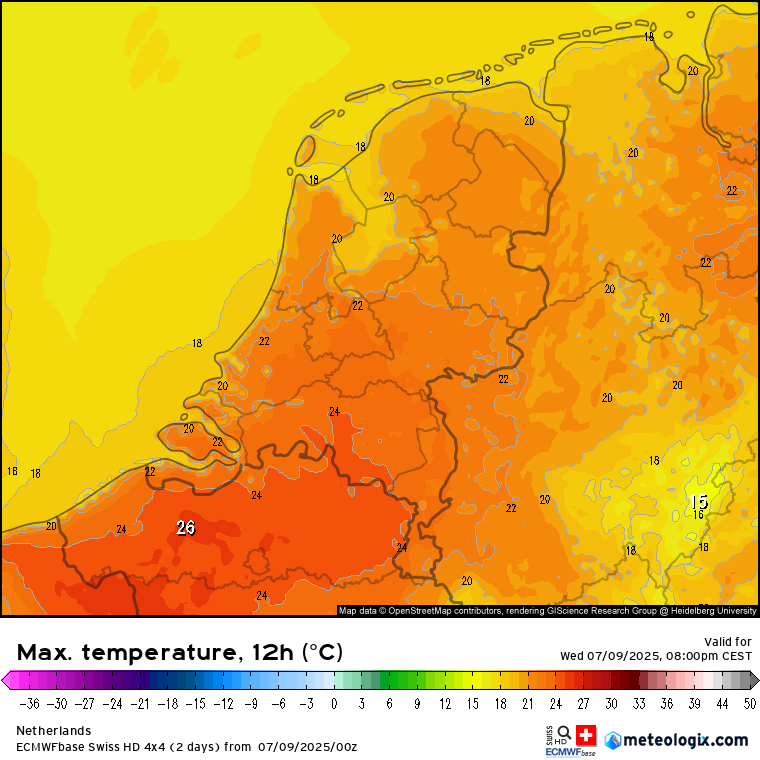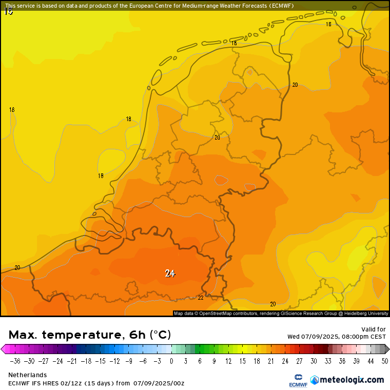 Het model laat voor vanmiddag bijvoorbeeld maxima tussen 19 en 23 graden zien, met 21 graden in De Bilt. GFS komt gemiddeld toch een volle graad hoger uit, ICON, Swiss-HD ook. HARMONIE misschien zelfs eerder 2 graden hoger. Het KNMI is zowel voor vandaag als morgen ook wat hoger gaan zitten dan ECMWF. Het KMI lijkt wel ECMWF aan te houden.