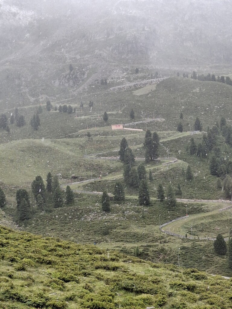 Gistermiddag aangekomen in Kuhtai op 2050 m. tijdens pittige sneeuwbui. Glad. Vanacht regelmatig sneeuwbuitjes. Was wit buiten. Nu niet meer. Maar 150 m hoger wel. Foto tijdens ontbijt vanmorgen.